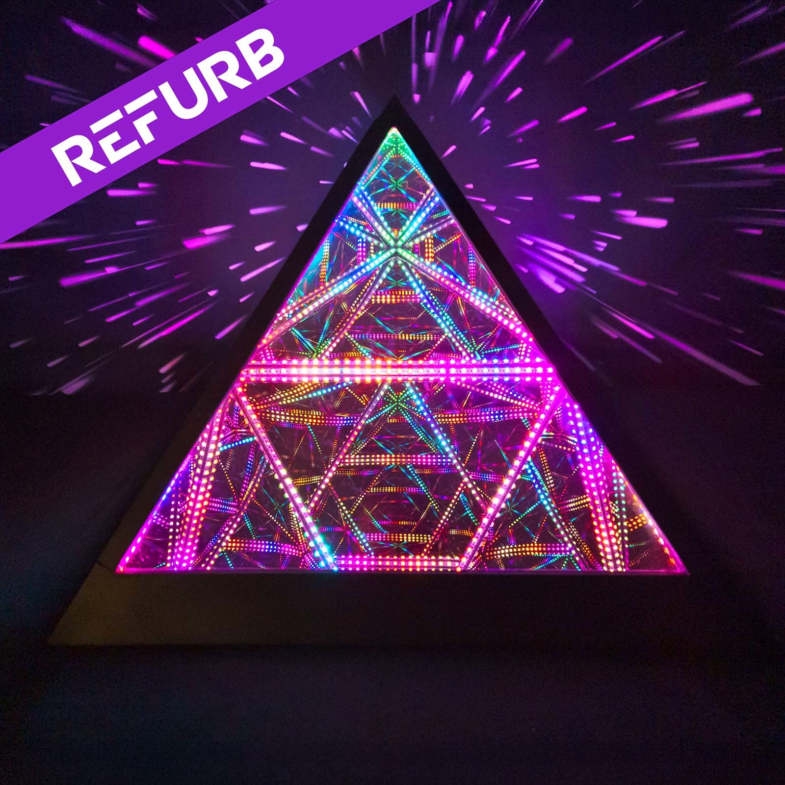 El HyperPyramid emitirá fotones tan pronto como se conecte. Por defecto, reproducirá patrones del modo "Kaleidoscopic", cambiando de patrón cada 60 segundos y generando nuevos colores aleatorios cada 10 segundos. Puede cambiar manualmente el patrón con una sola pulsación del botón en la caja de control y cambiar de modo con una doble pulsación. Mantener presionado el botón durante 2 segundos apaga los LEDs. Para un control y personalización adicionales, descargue y conecte la aplicación Hyperspace Lighting!